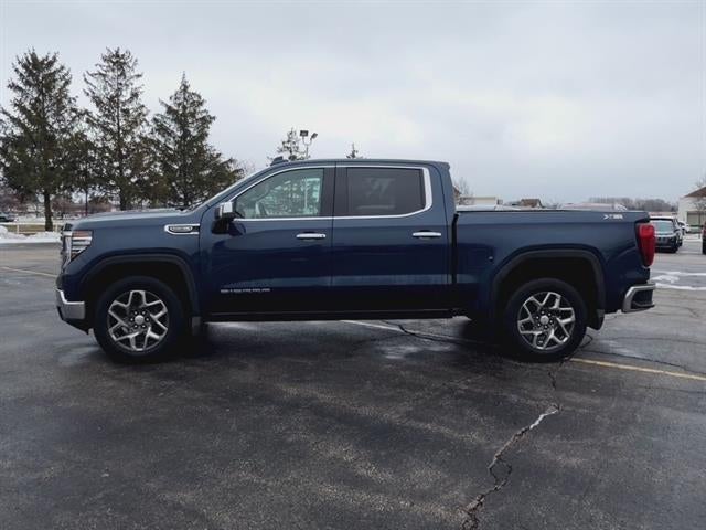 Experience power, comfort, and advanced technology with this Blue 2023 GMC Sierra 1500 4x4 SLT Crew Cab. Equipped with the robust EcoTec3 5.3L V8 engine and a 10-speed automatic transmission, this truck is ready for work or play. Enjoy a suite of tech features including a massive 13.4-inch touchscreen with Google Built-In, wireless Apple CarPlay and Android Auto, Amazon Alexa compatibility, and onboard Wi-Fi hotspot. Stay safe with front and pedestrian automatic emergency braking, lane keeping assist, and a rearview camera. The SLT trim offers luxury with leather-trimmed upholstery, heated and ventilated front seats, a heated steering wheel, and a customizable 12.3-inch digital instrument cluster. The multi-function tailgate, power folding mirrors, and remote engine start add convenience. Whether towing, hauling, or commuting, the Sierra's 4x4 capability, trailer hitch, and advanced driver assistance systems deliver confidence and control. Ready for its next adventure-schedule your test drive today!